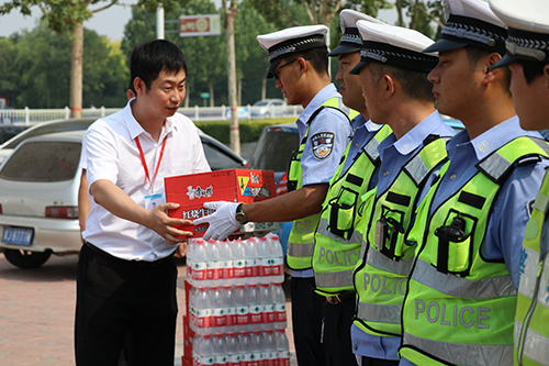 無論是寒冬的三九天還是酷夏的高溫日,他們都像一顆顆白楊挺拔的站在我們出行的路口處。霧霾嚴重的惡劣天氣、炎炎夏日的煩躁時節(jié),都有他們?yōu)槲覀兪刈o平安。在這夏至時節(jié)滄州智博信息技術有限公司自發(fā)組織了交警慰問活動,同時給五個站點的交警同志送去了礦泉水、冰糖雪梨、方便面、口罩等解暑物資。為滄州的交警同志送去了炎炎夏日的一絲清涼并表達了內(nèi)心的關切。